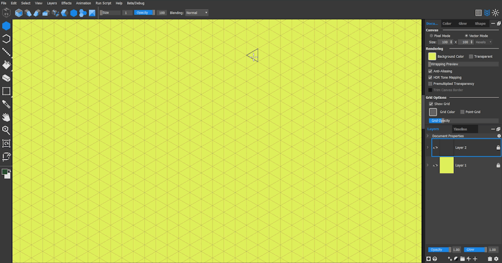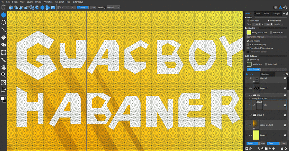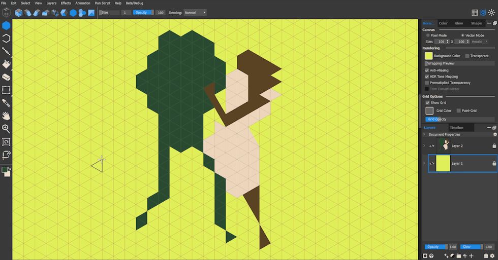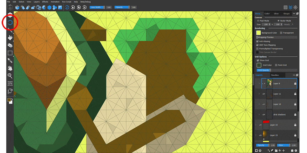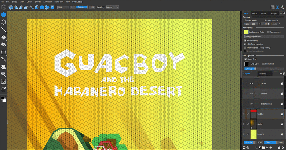 I enlarged the canvas to 100×100 Hexels in the Canvas tab (top right) to allow room for moving elements around later. The poster will have a Mexican flair, so I’m changing the background color to a bold yellow (hex: e4f75f).