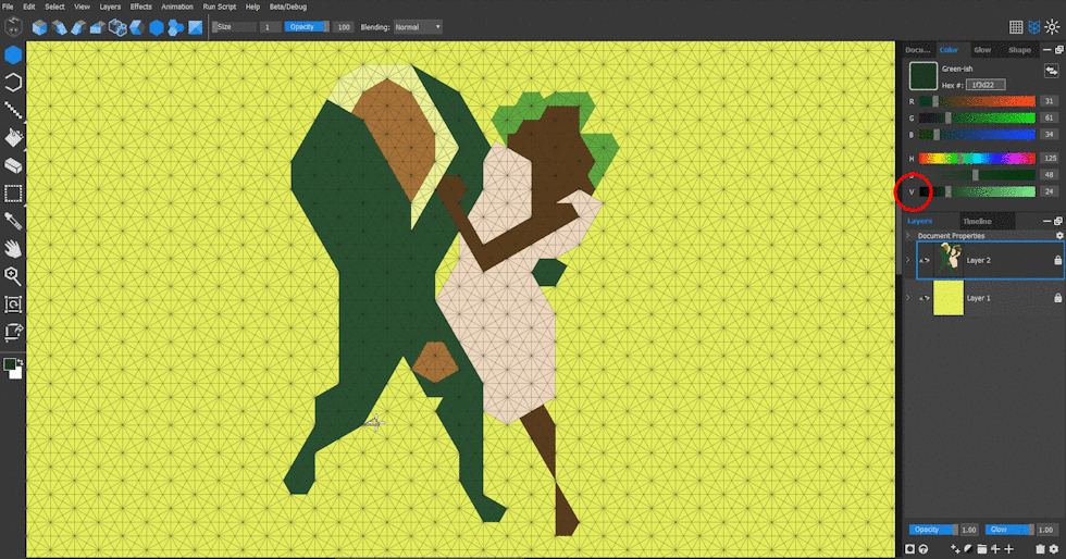 To make shapes and angles more defined, I added highlights and shadows to the characters by adjusting the Value slider (circled) in the Color tab.