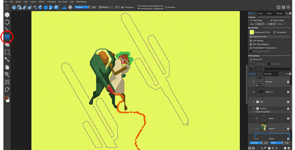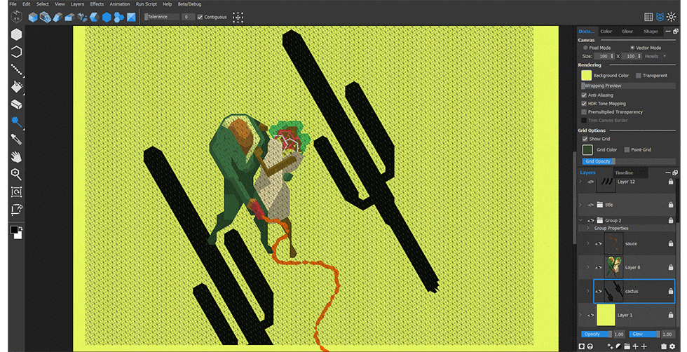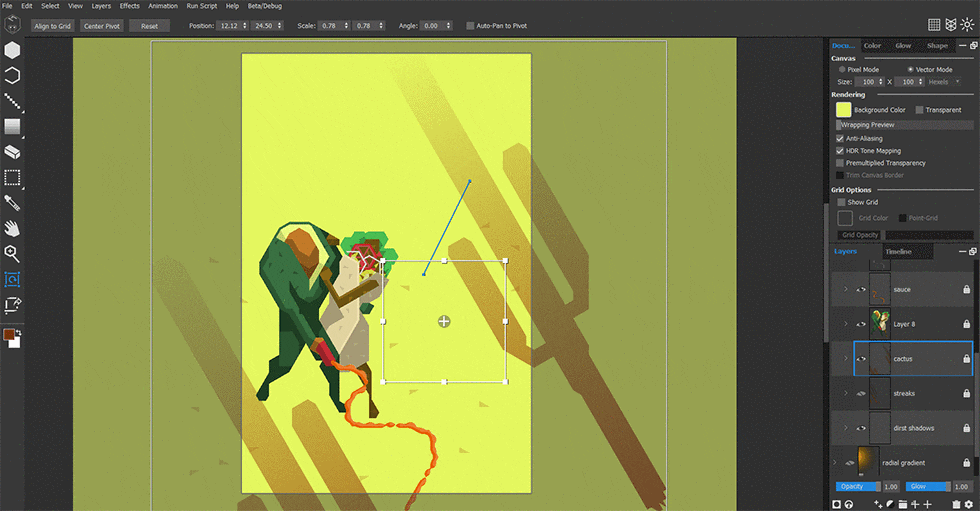 The next step was to create cactus shadows. I drew elongated cactus silhouettes on a new vector layer using the Ramp Right grid (alt+2). Using the Magic Wand tool (S), I selected the first cactus and held down the Shift key to add additional selections. Pressing the Delete key (on keyboard) left the selection empty ready for the next step.