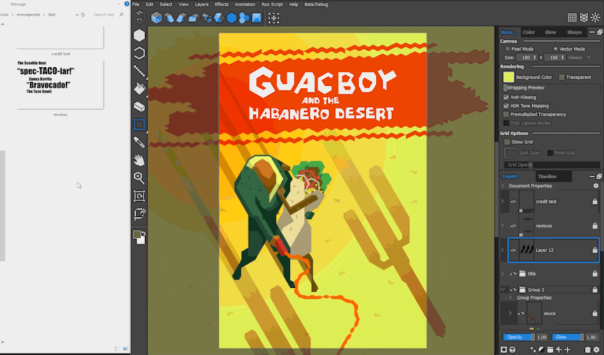 Creating gloopy hot sauce couldn’t be simpler. On a new vector layer, I drew an S curve using the Shards sub-grid. To improve the look of the sauce, I navigated to Effect > Add Layer Effect > Distort > Blob.