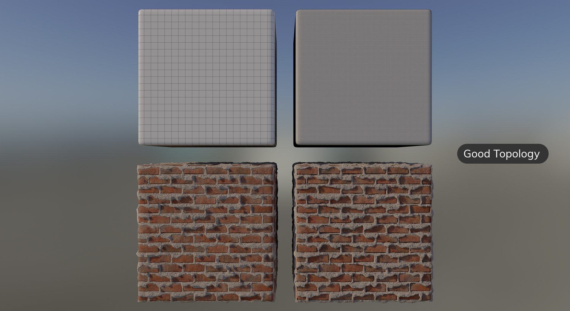 When each cube mesh is subdivided, additional triangles are added to both, but the base mesh topology determines where the subdivisions occur. On the cubes with uneven topology (left), the large triangles fail to subdivide as effectively as the smaller ones, resulting in less detailed displacement. In contrast, the cubes with even topology (right) subdivide more practically and predictably, allowing for uniform displacement. Notice how the uneven topology on the right causes the cube to warp and pucker in areas lacking sufficient triangles, leading to visible artifacts and shadow issues.