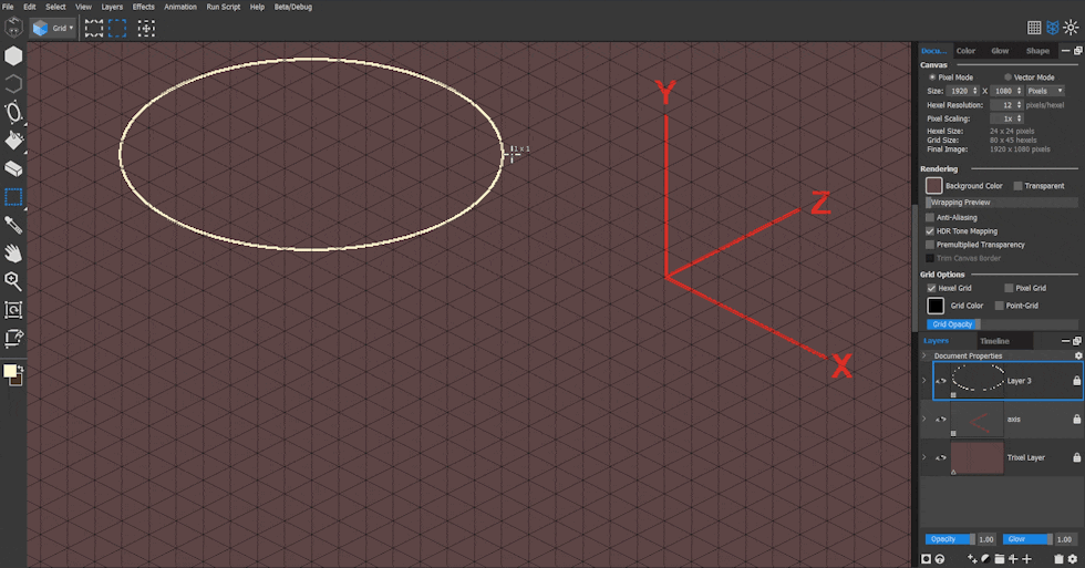 Holding Shift while drawing an Ellipse snaps the cursor to the grid. I clicked once and moved the cursor 5 trixels along the Z axis. This initial trixel line is the ellipse diameter. Before my second mouse click, I held down the Alt key to change the diameter line into the radius, doubling the diameter length. I performed the second mouse click and expanded the visible ellipse 5 trixels along the X axis before clicked again. The ellipse has blue control points that allow you to resize, move or scale the shape before committing. Pressing Enter confirms the shape.