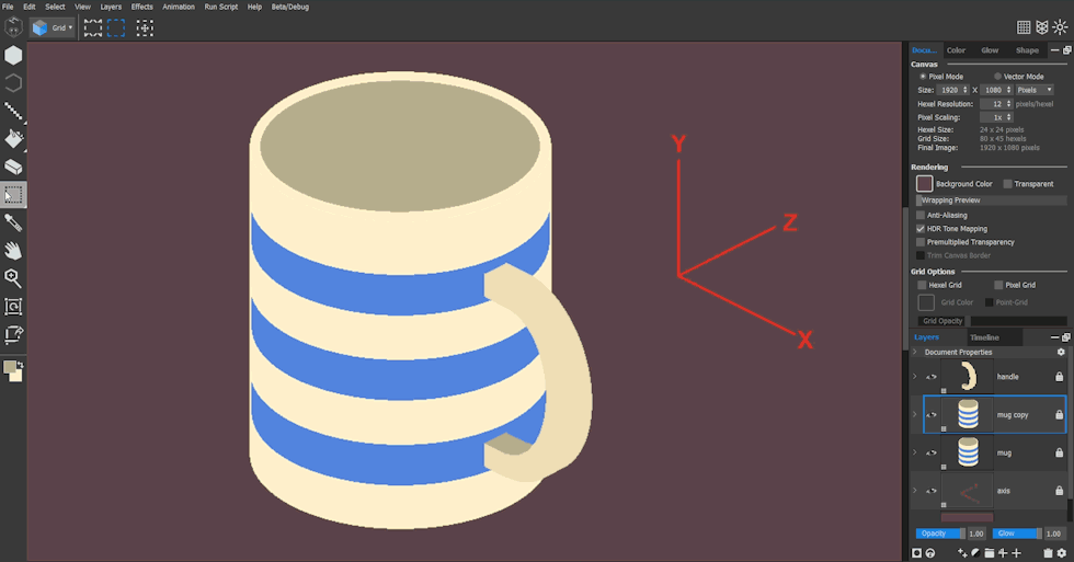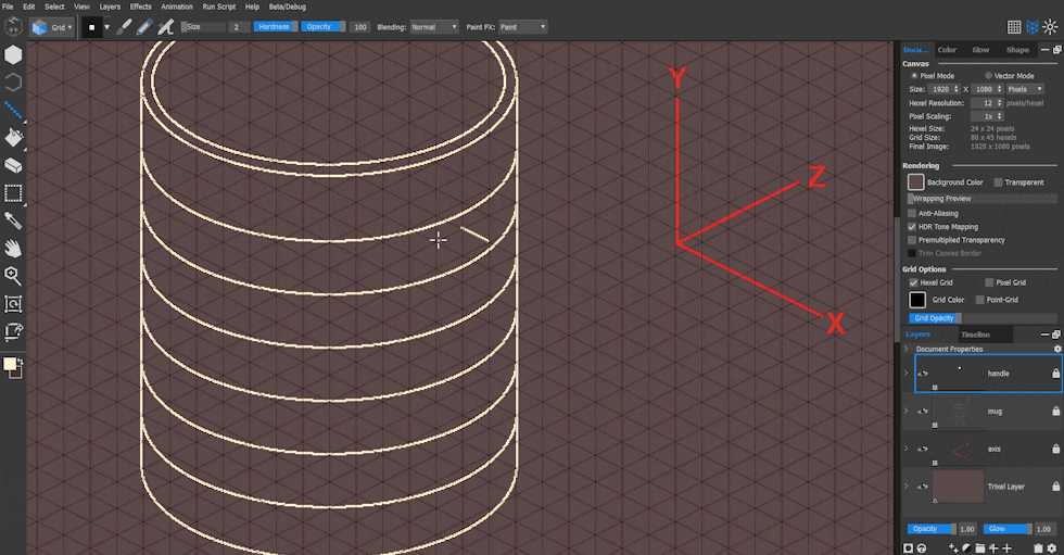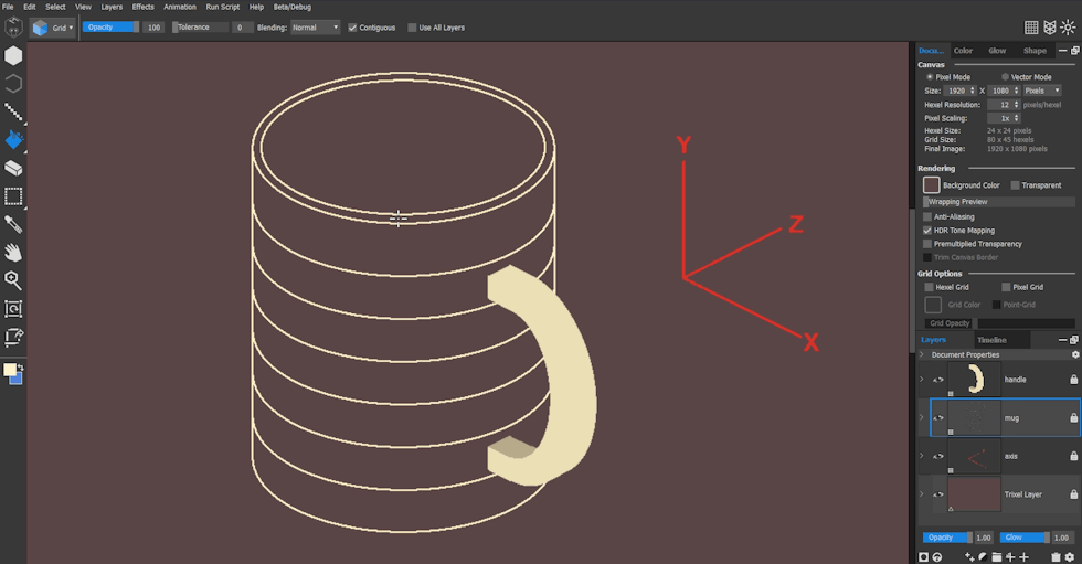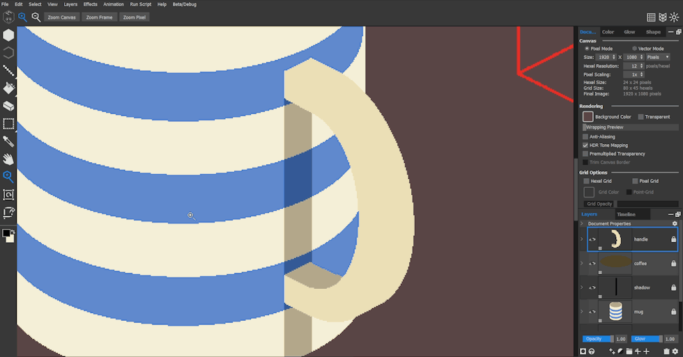 Let’s start with the striped mug. I created a new pixel layer and changed my background and grid colors in the Document tab for clarity. I changed the Brush Size and selected the Pixel Square brush from the drop-down brush preset menu.