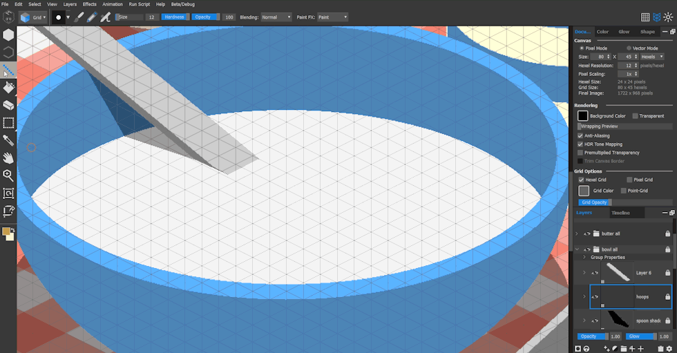 I painted various tabletop objects using pixel layers and the tablecloth on a vector layer. I was aiming for a high resolution with pixelated edges, so the Pixel Trixels 1080p template was ideal.