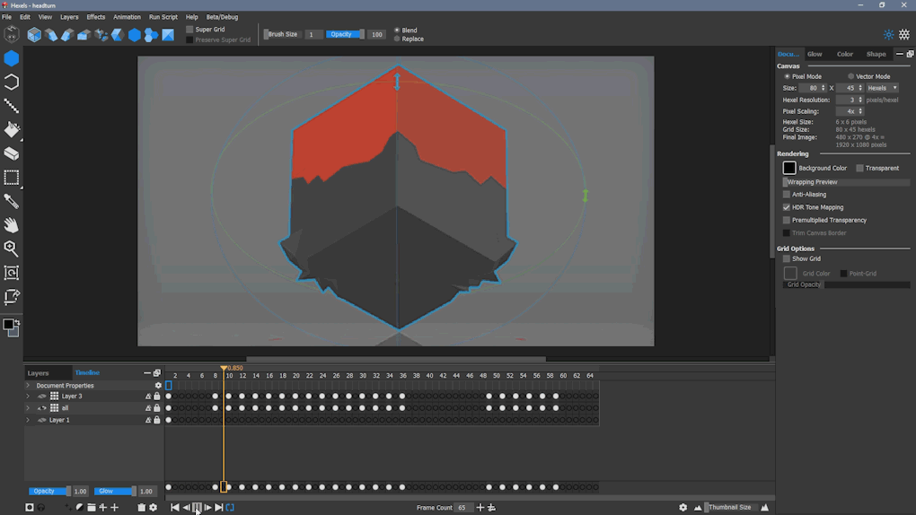 I started by creating a short 180° turn amination with a 3d model of the Hexels monkey head Logo in a 3D package. I exported the frames of the animation and then imported the entire sequence of images into Hexels, all at once, by simply dragging it onto my hexels canvas. This gives the option to add each image on its own layer of the entire sequence as a single layer animation.